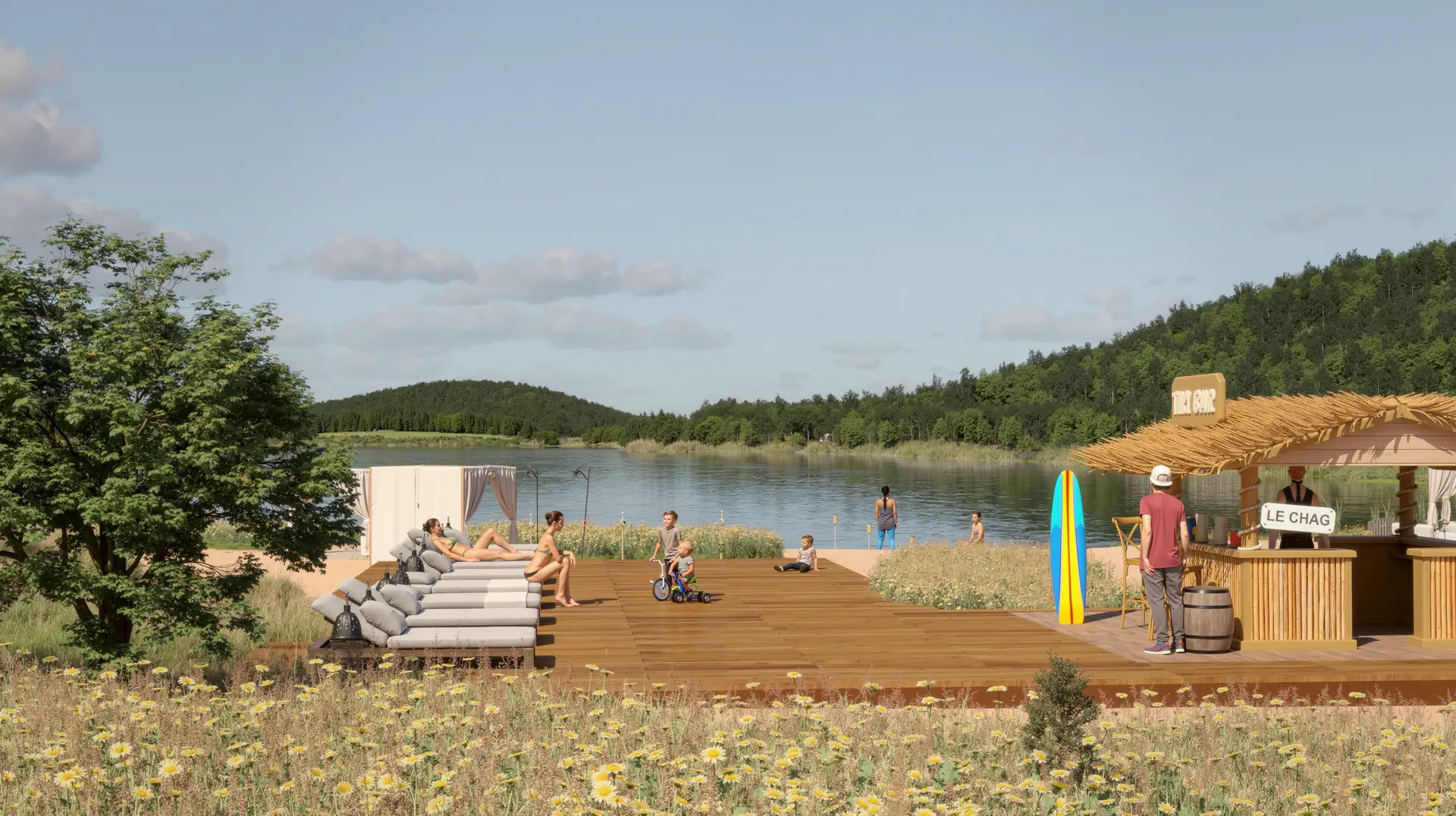 Un pavillon d’accueil sera aménagé sur le bord du lac Major, proposant des services de location de bateaux et un point d’accès privilégié au lac.